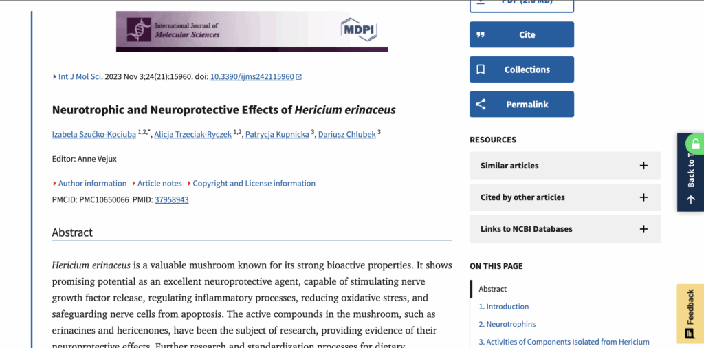 Szućko-Kociuba I, Trzeciak-Ryczek A, Kupnicka P, Chlubek D. Neurotrophic and Neuroprotective Effects of Hericium erinaceus. Int J Mol Sci. 2023 Nov 3;24(21):15960. doi: 10.3390/ijms242115960. PMID: 37958943; PMCID: PMC10650066.
