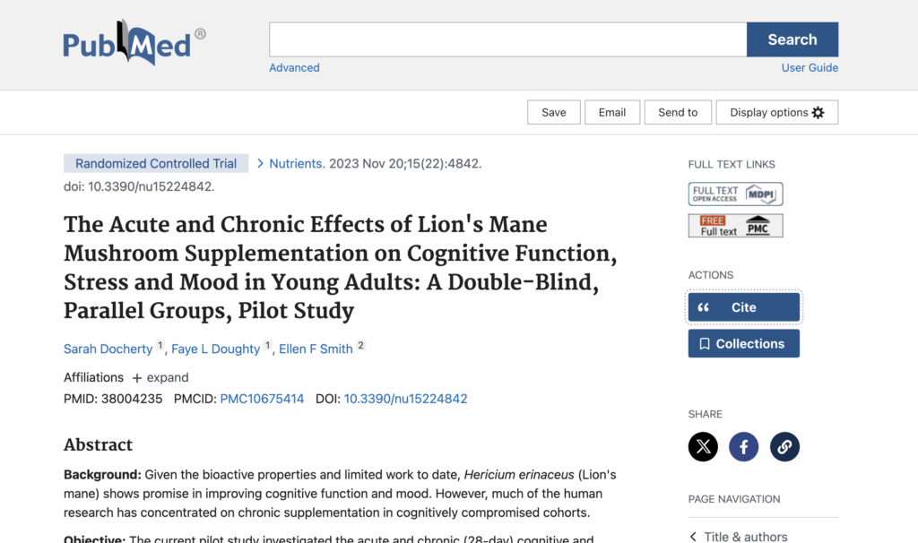 Docherty S, Doughty FL, Smith EF. The Acute and Chronic Effects of Lion’s Mane Mushroom Supplementation on Cognitive Function, Stress and Mood in Young Adults: A Double-Blind, Parallel Groups, Pilot Study. Nutrients. 2023 Nov 20;15(22):4842. doi: 10.3390/nu15224842. PMID: 38004235; PMCID: PMC10675414.
